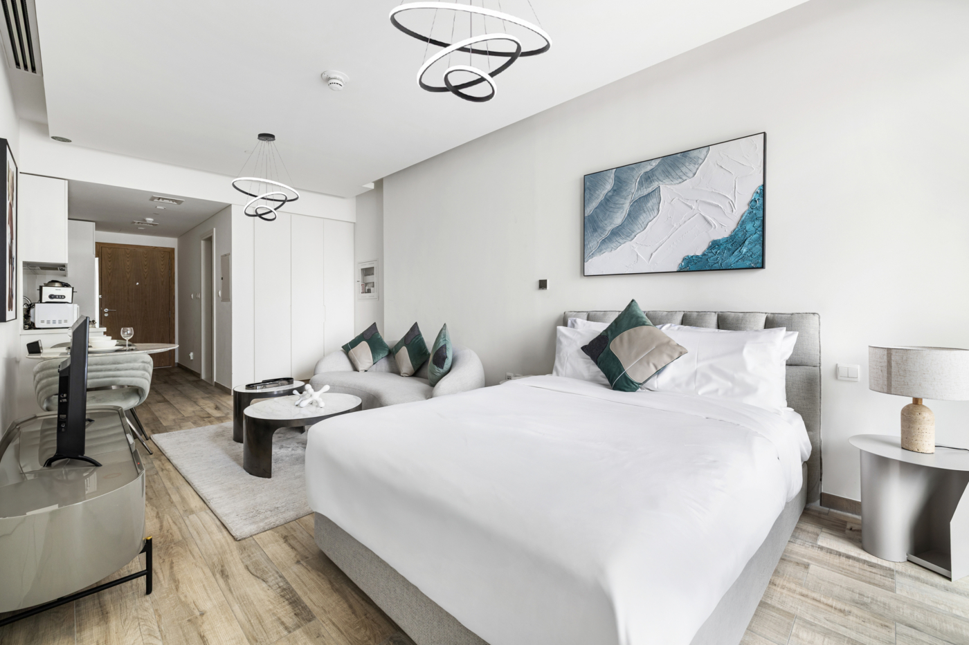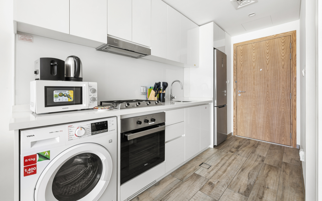 Designed in soft white and light grey tones with black accents and light wood furnishings, this studio combines modern aesthetics with a calm, relaxing atmosphere. Large windows bring in plenty of natural light, while thoughtful layout details ensure comfort and everyday practicality. A private balcony with community and city views adds a pleasant outdoor extension to the living space.