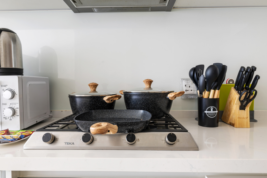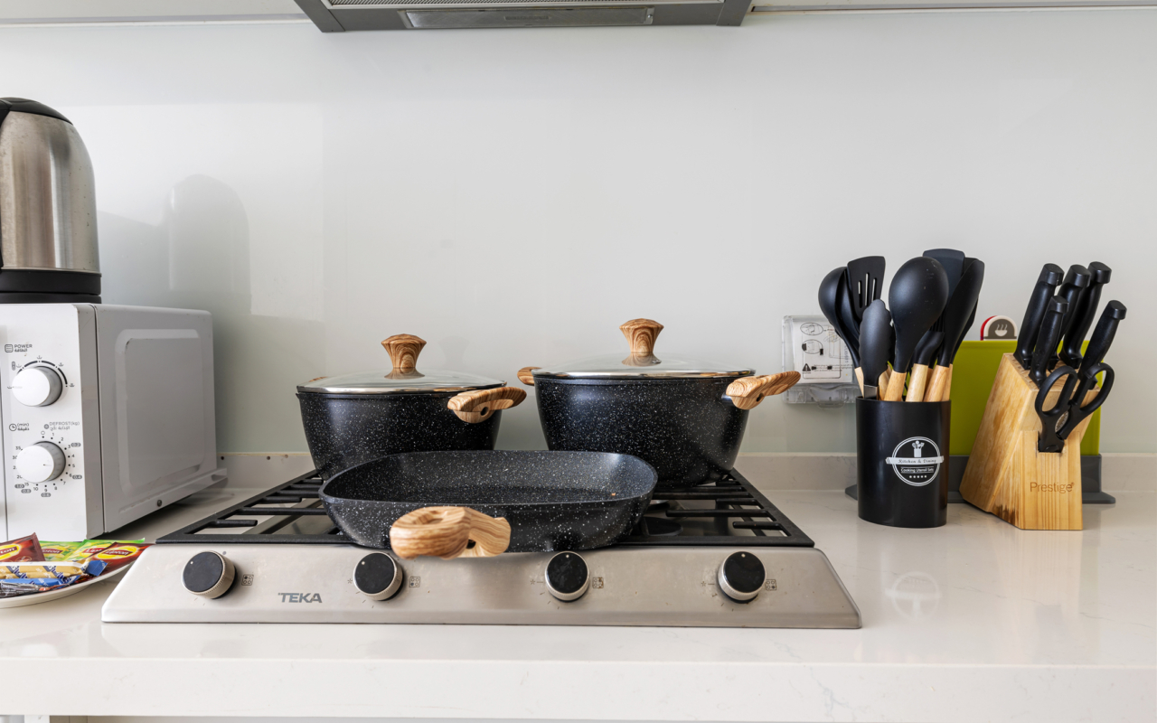 • Full cookware, utensils, cutlery, and tableware