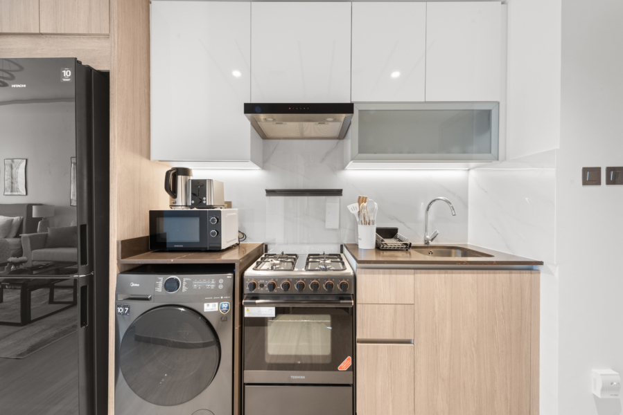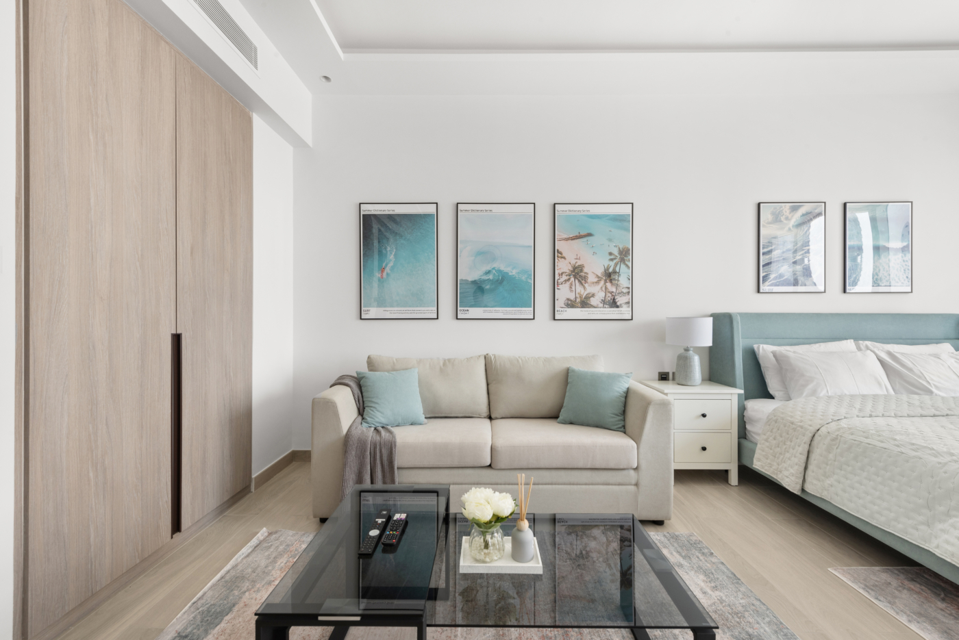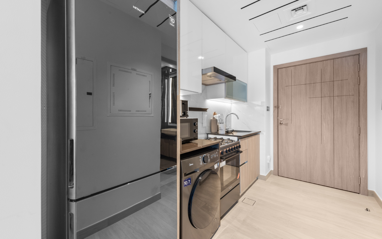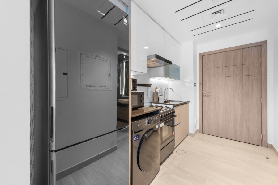 This bright studio is thoughtfully designed with soft neutral tones, quality furnishings, and modern finishes. With a cozy sleeping area, fully equipped open kitchen, private balcony, and a spacious bathroom, the apartment offers a blend of functionality and elegance perfect for singles, couples, and long-stay residents.