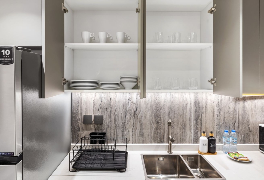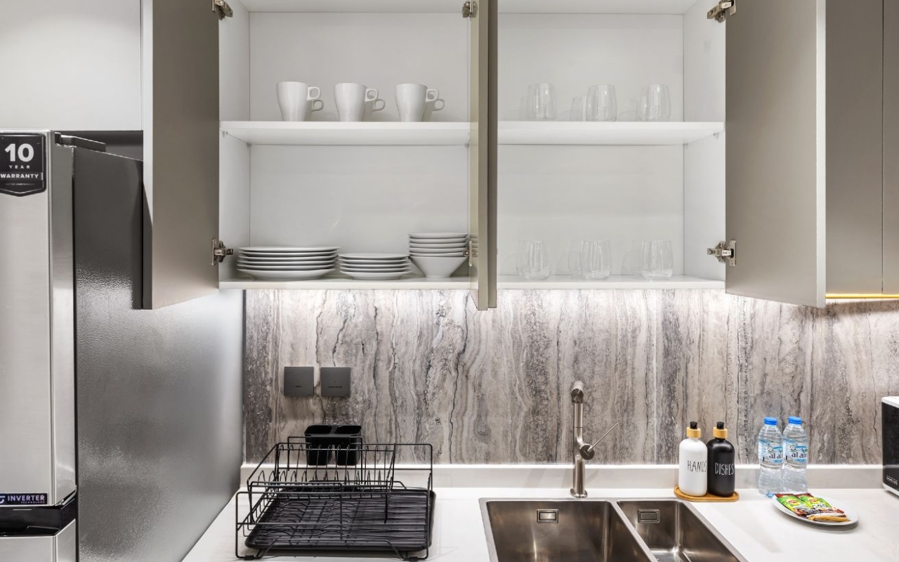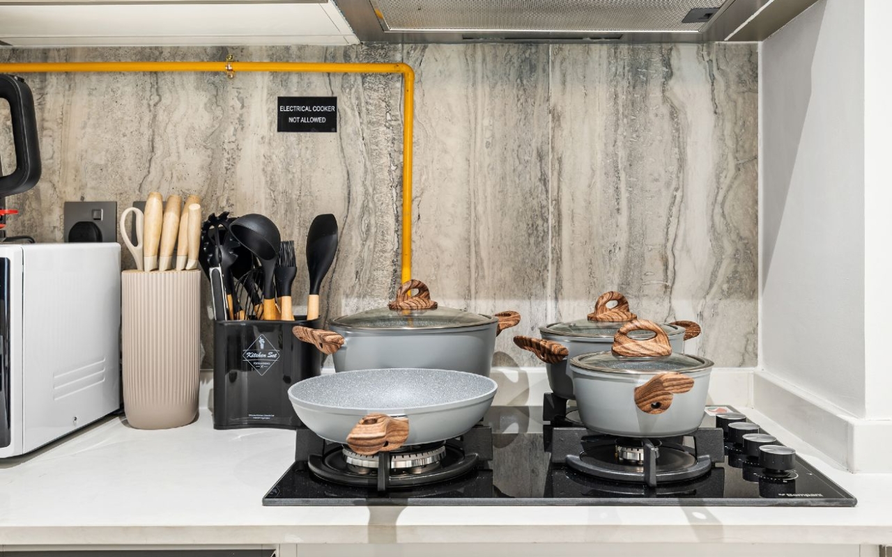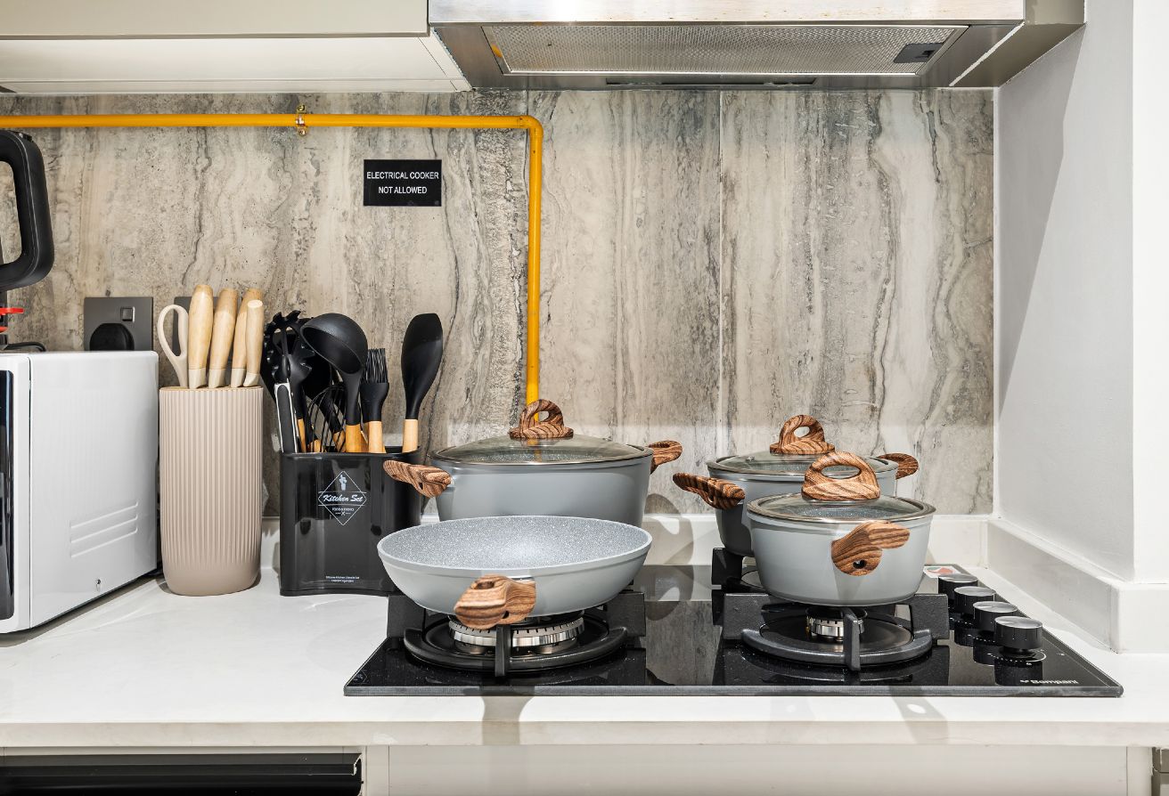 • Full set of cookware, cutlery, and utensils