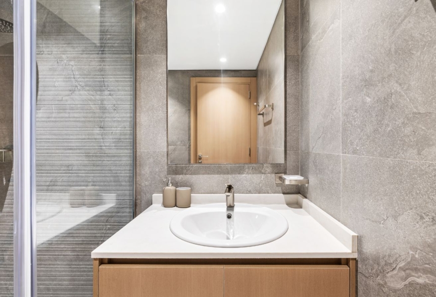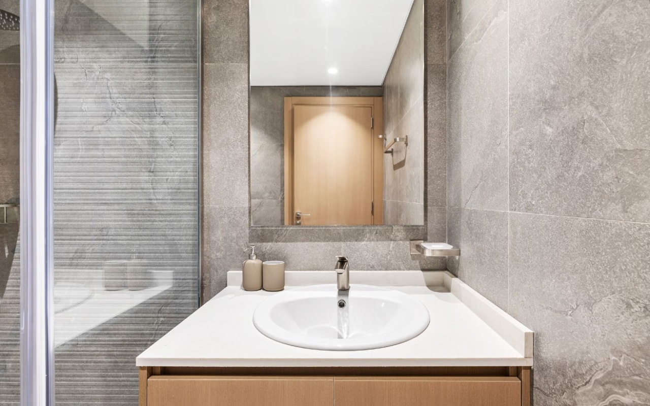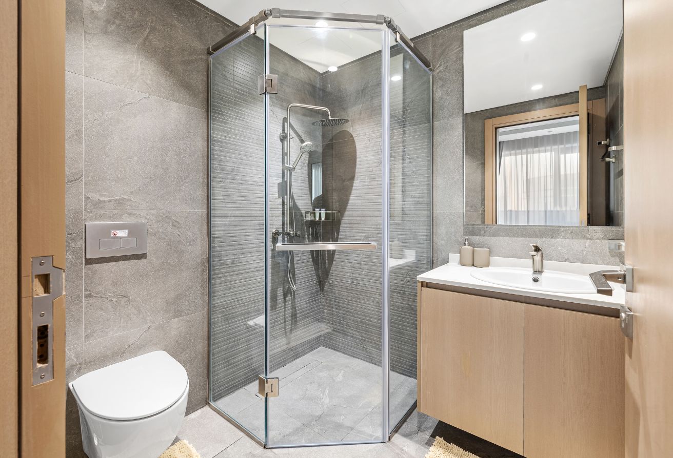 Modern with clean finishes, large mirror, walk-in shower, and all essentials.