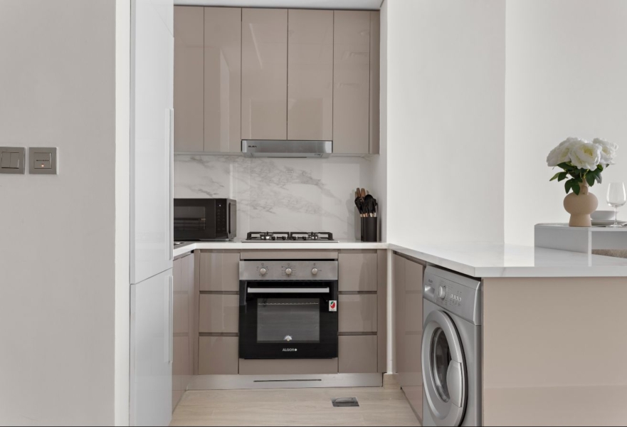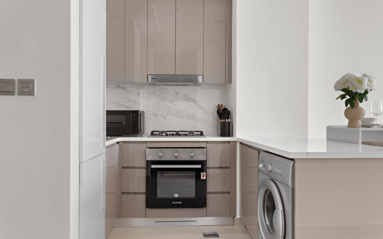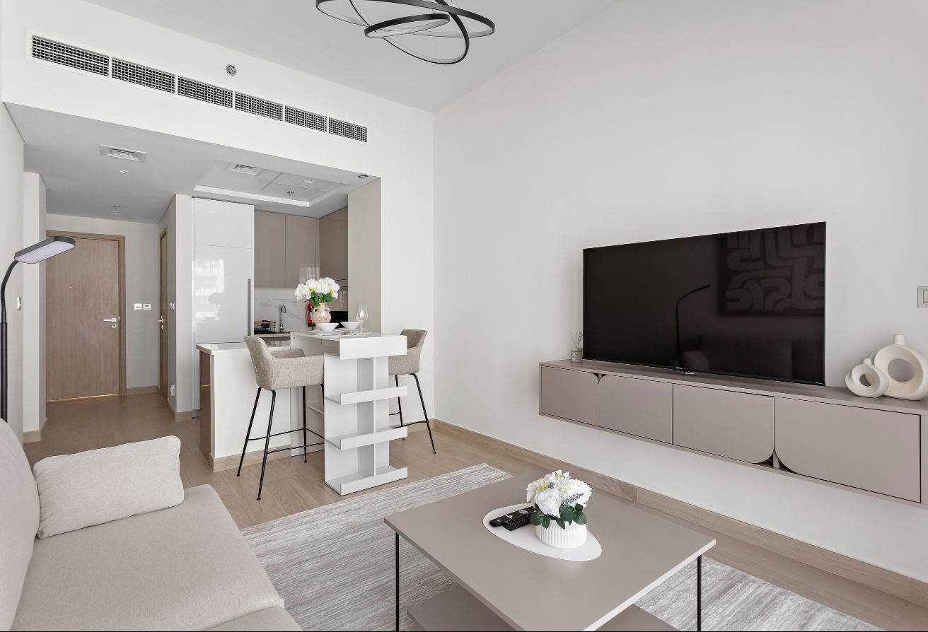 This beautifully furnished 1-bedroom apartment offers a modern and elegant living experience with interiors finished in white, light grey, cream, and light wood accents. The layout feels open and welcoming, with large windows that fill the home with natural light. Central AC ensures year-round comfort.