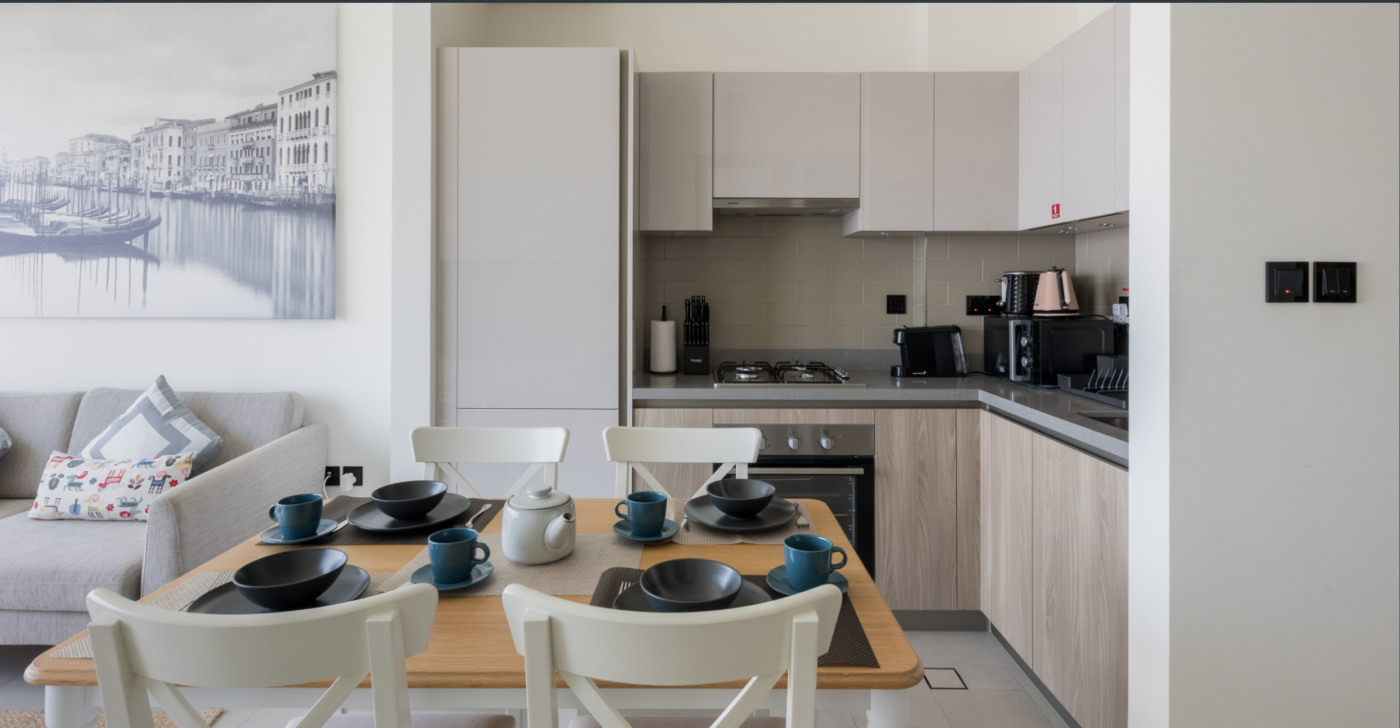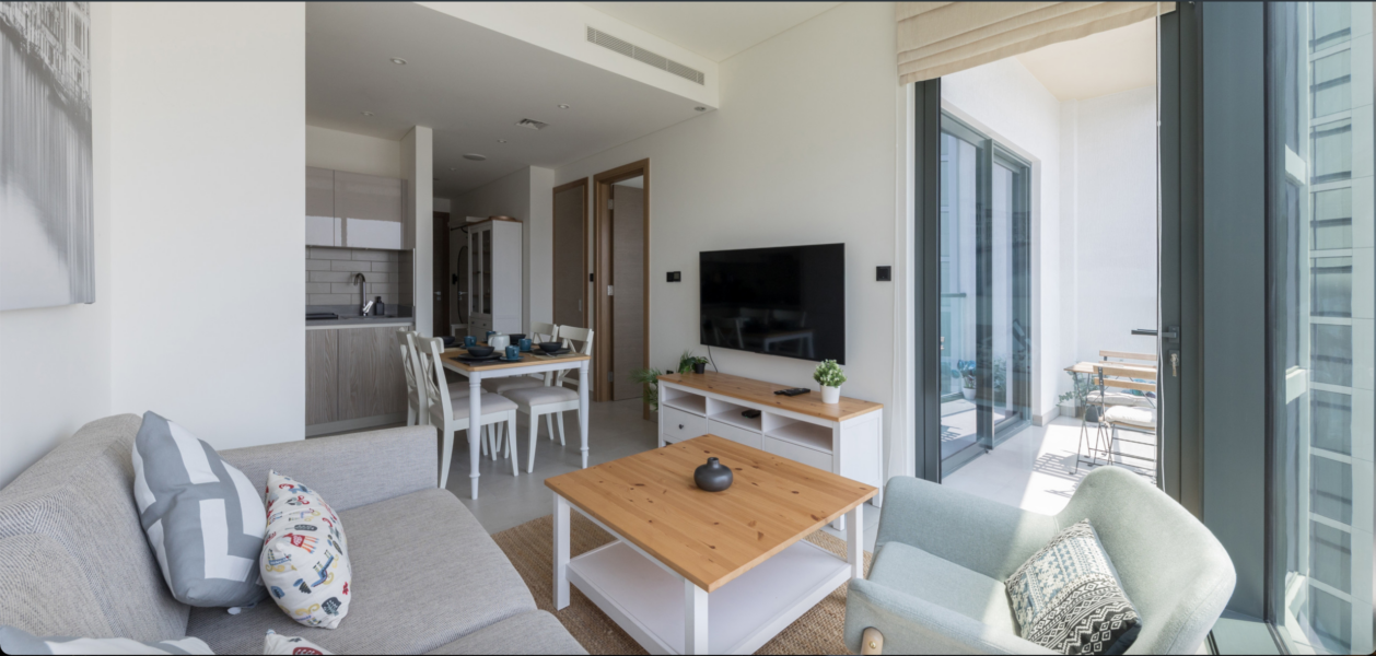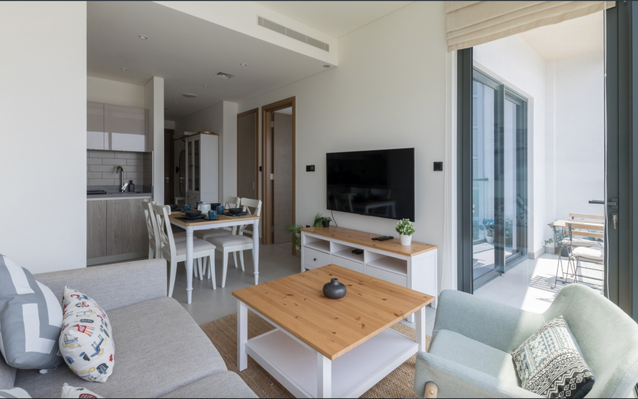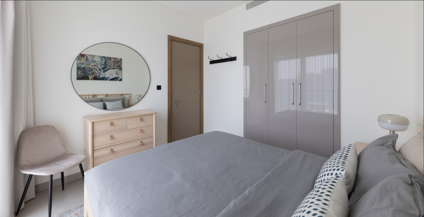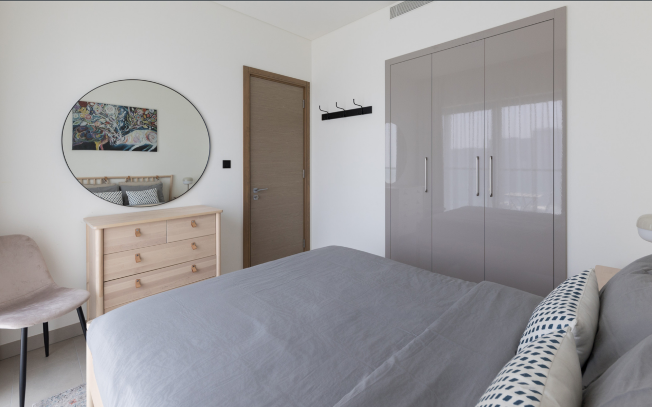 This cozy Swedish-style home features warm wood accents, floor-to-ceiling windows, a modern open kitchen, a calming bedroom, a spacious bathroom, and a balcony with community and park views. Perfect for singles or couples seeking a quiet, design-focused home in one of Dubai’s greenest waterfront communities.